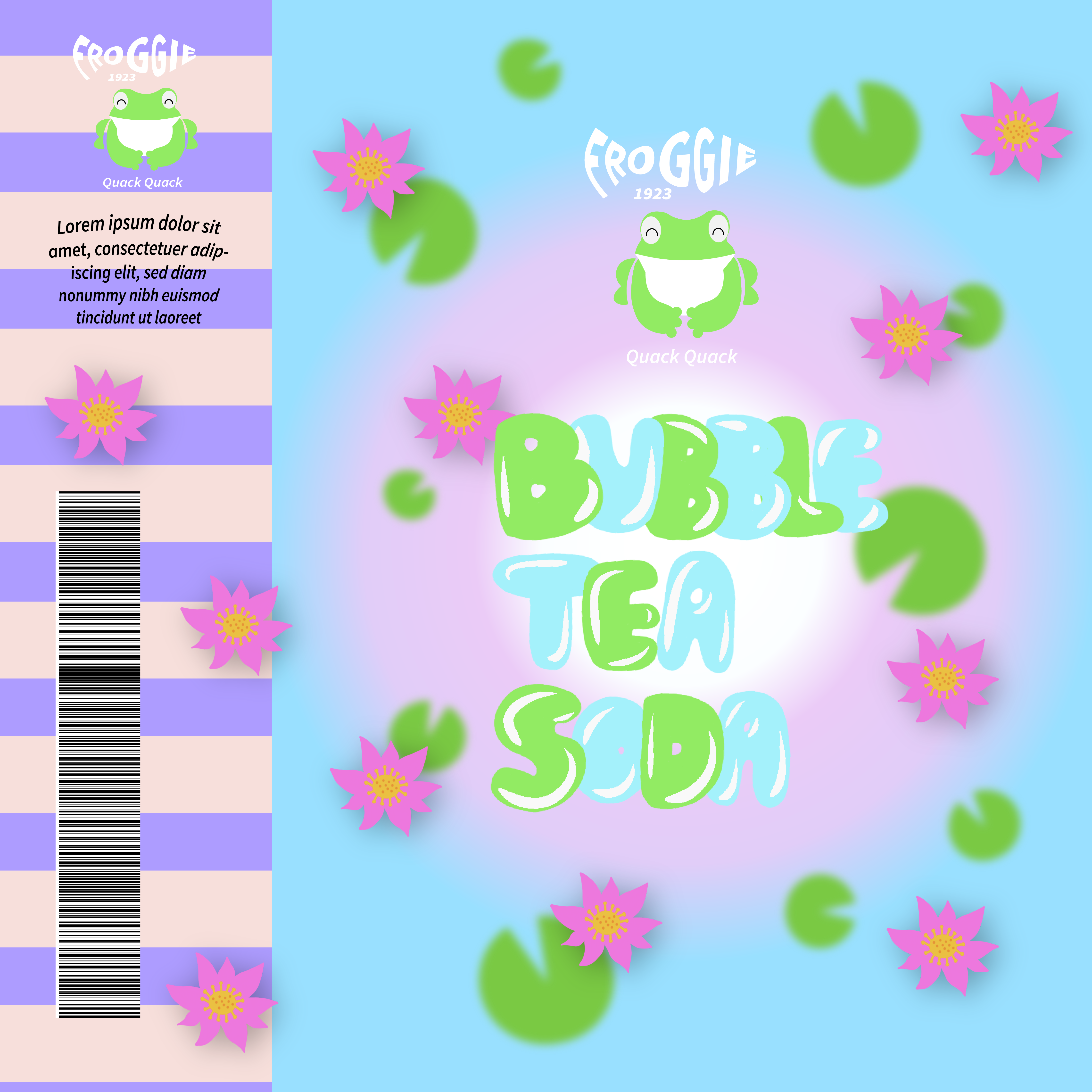 However, since this project is a personal creation without the support of a marketing team, I approached it from a designer’s perspective. I envision the frog character in a bright green color, paired with a funky, playful typeface. The lively typography is meant to capture the feeling of bubbles dancing on the tip of the tongue, bringing a sense of energy and fun. Since this is a summer drink, it's important to use light, refreshing colors throughout the design.