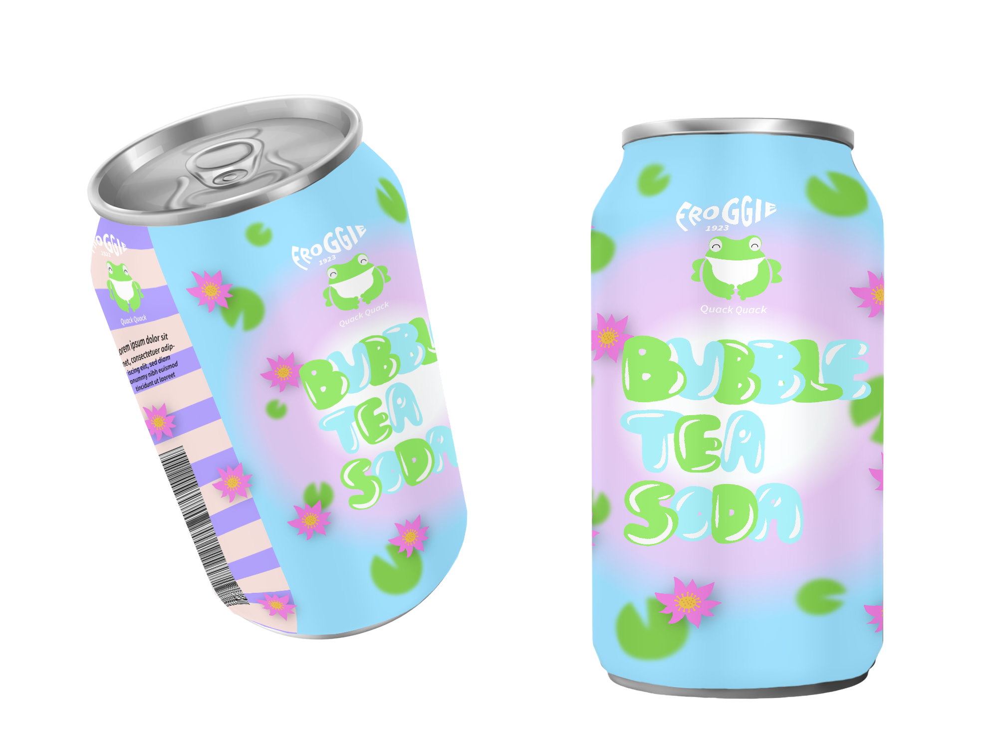 Thinking Process: I often see companies on LinkedIn looking for beverage packaging designers, so I decided to create a concept for an aluminum foil can design inspired by a brand story. Being from Taiwan, the first drink that came to mind was "Boba Tea." Although Boba tea is traditionally packaged in a plastic cup, I wanted to reimagine it in an aluminum foil can. To make it more distinctive, I thought about creating a boba tea drink featuring tapioca pearls. In Taiwan, we sometimes call tapioca pearls "frog eggs" because they resemble real frog eggs in appearance. That gave me the idea to design a logo featuring a frog.