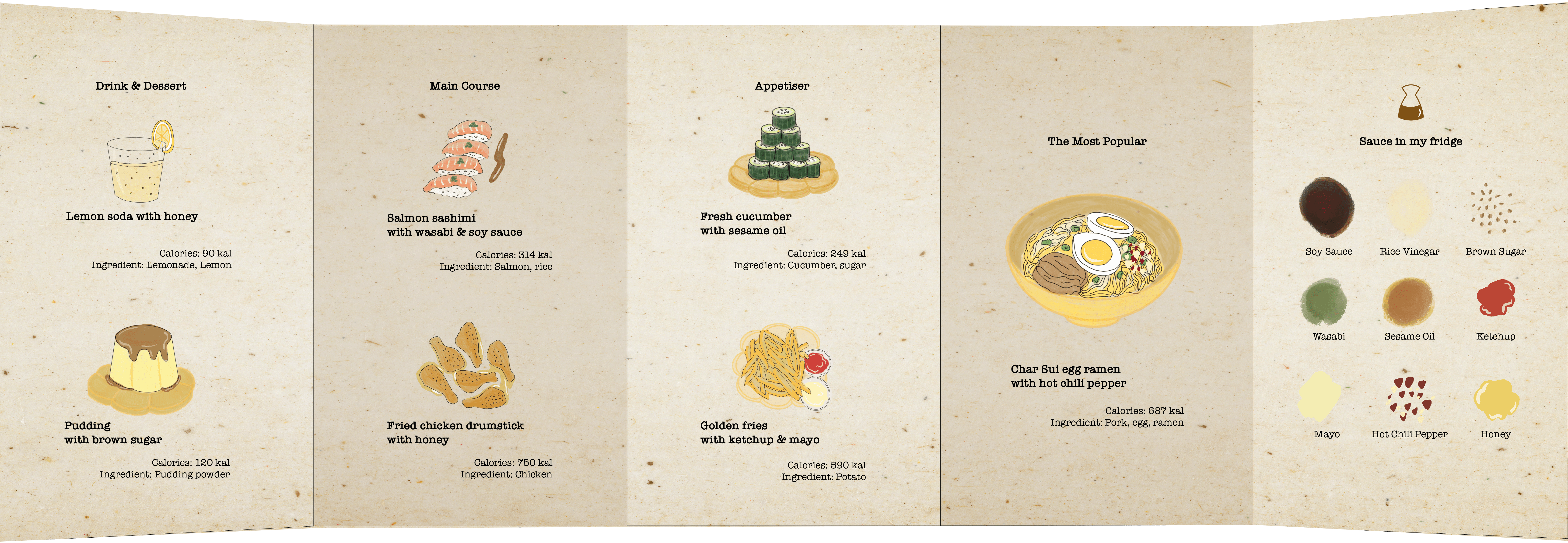 Woody colors are often associated with Japanese architecture because most Japanese buildings were originally simply built with wood. Because the restaurant aims to be simple and happy, I think the menu can best express the approachable presentation of food by drawing it, just like the feeling of a handwritten card rather than a printed card. The warmth that can be felt from the words is different.